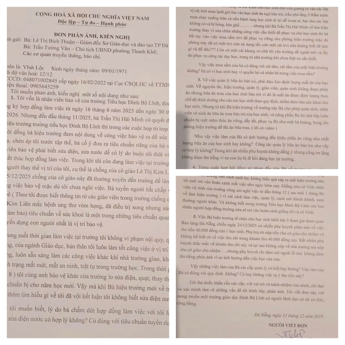 Ông Vĩnh Lộc, trú TP Đà Nẵng vừa có đơn gửi bà Lê Thị Bích Thuận, Giám đốc Sở Giáo dục và đào tạo TP Đà Nẵng; bà Trần Tường Vân, Chủ tịch UBND phường Thanh Khê, TP Đà Nẵng và các cơ quan truyền thông, báo chí kiến nghị một số nội dung liên quan đến bà T.T.H.M, Hiệu trưởng Trường Tiểu học Đinh Bộ Lĩnh.