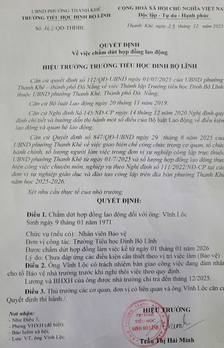Mạng xã hội đang chia sẻ về việc, vừa qua một nhân viên bảo vệ bị Hiệu trưởng Trường Tiểu học Đinh Bộ Lĩnh, phường Thanh Khê, (thành phố Đà Nẵng) sa thải. Sự việc đang gây xôn xao dư luận, liệu Hiệu trưởng Trường Tiểu học Đinh Bộ Lĩnh, phường Thanh Khê, Đà Nẵng sa thải bảo vệ có đúng luật?