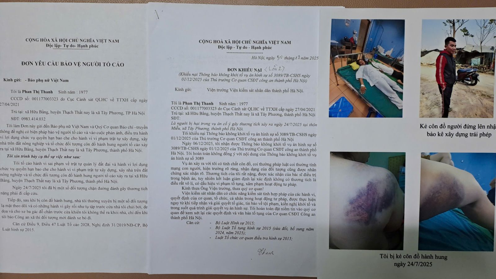 Bà Thanh cho biết: “Trước sự việc bị đánh vào 24/7/2025, tôi đã rất nhiều lần bị đe dọa, chửi bới. Trong quá trình sinh sống ở làng xã, tôi không gây thù chuốc oán với ai. Chỉ sau khi tôi gửi đơn tố cáo một số cán bộ xã Hữu Bằng (cũ) bao che cho hàng loạt công trình xây dựng trái phép trên đất nông nghiệp thì tôi mới bị như thế”.